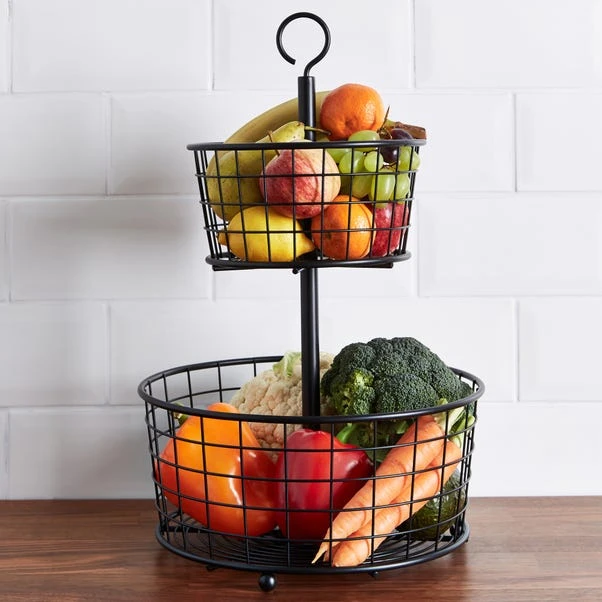 Made from steel and finished in black, this two tier wire fruit basket offers additional storage for your fresh fruits for neat space saving storage. Easy to wipe clean when required, this two tier fruit bowl will look stylish on your dining table or kitchen work top.