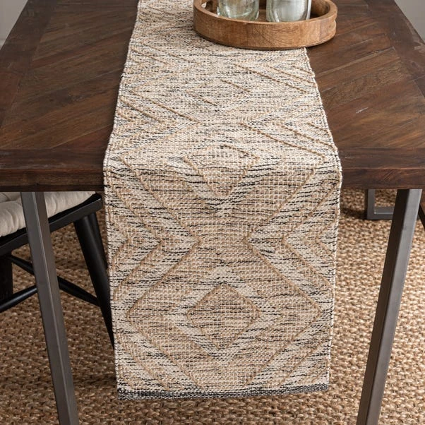 This stunning table runner in a natural colourway will complement an array of decors and is made from recycled cotton and jute. Raised diamond detailing in jute contrasts beautifully with the multi-tonal soft cotton. Available in 2 sizes to suit your table size, you can coordinate with other matching items from our Aztec Jute range.