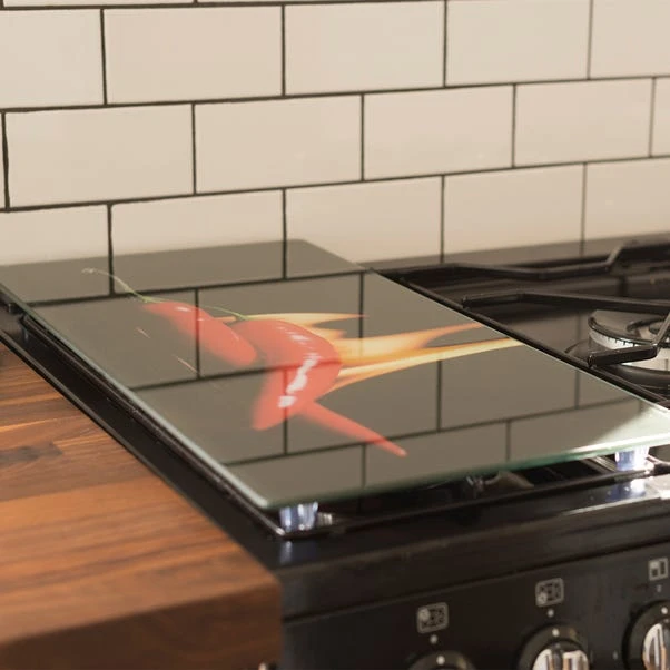 Made from reinforced glass, this cover can help protect the hob from scratches and spills, easy to wipe clean, this kitchen accessory is finished with bright decorative chillis.