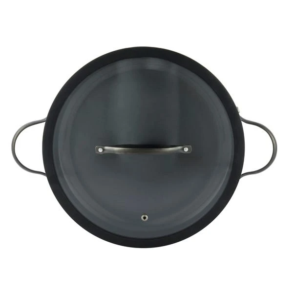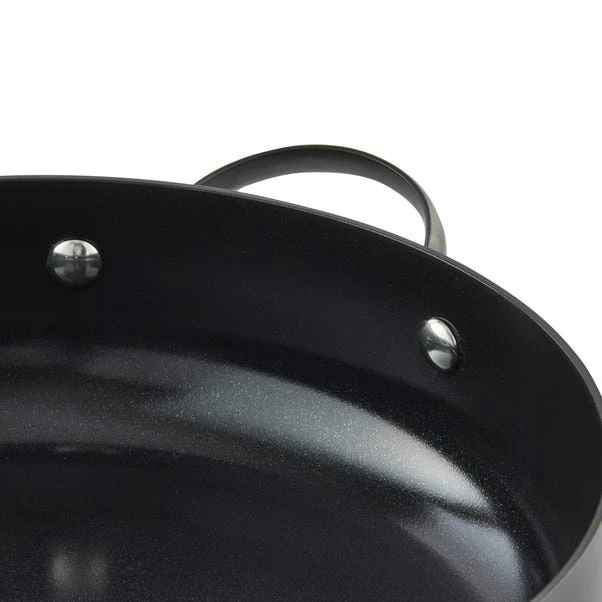 Suitable for use on all cookers, including induction, this pan with a scratch resistant ceramic non-stick has a glass lid and silicone rim. With handles made from cast stainless steel, this piece is both dishwasher and oven safe, up to 220 degrees.